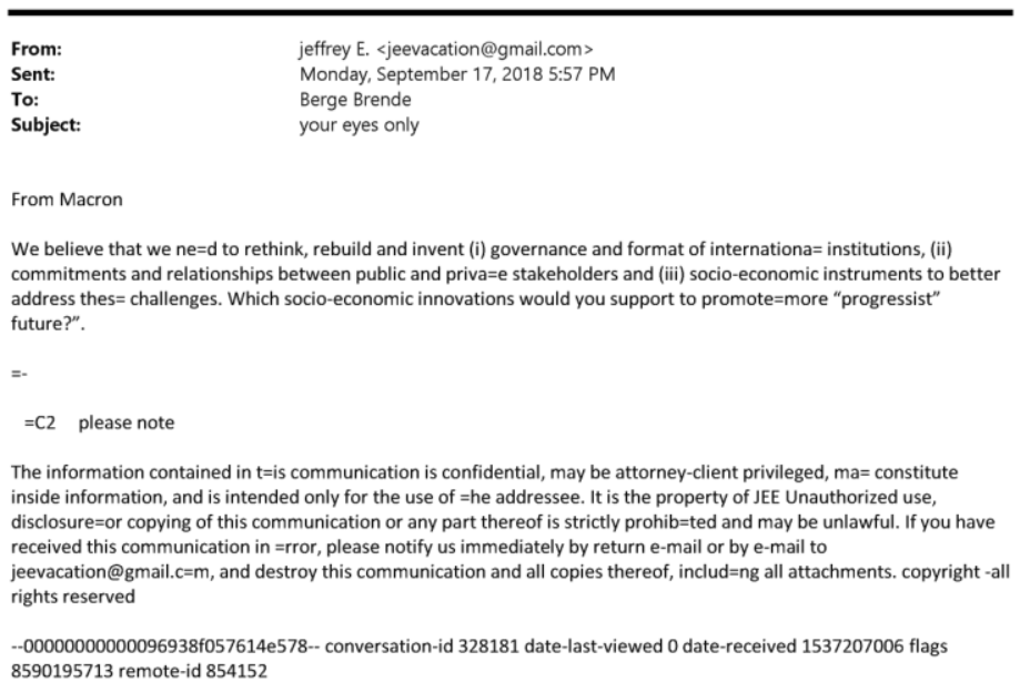 Además, en una anotación fechada el 29 de marzo de 2019, Epstein afirma en una comunicación dirigida a Steve Bannon que se encuentra «con todo el Gobierno de Macron».